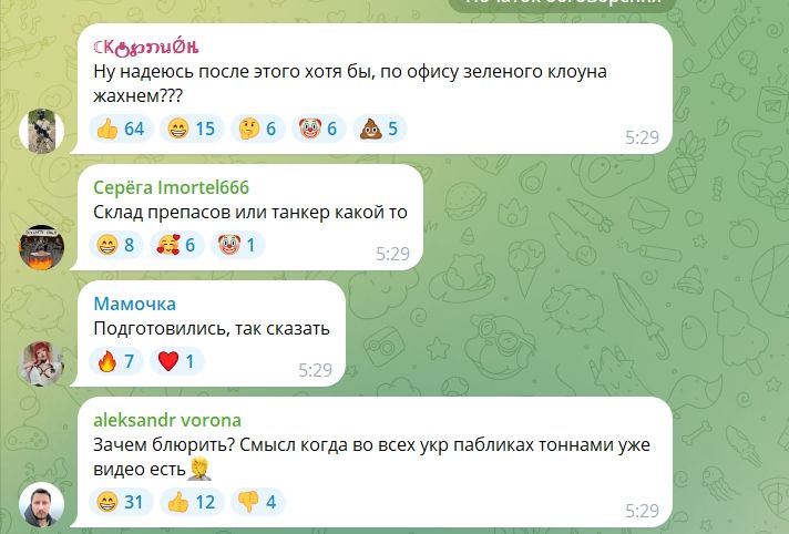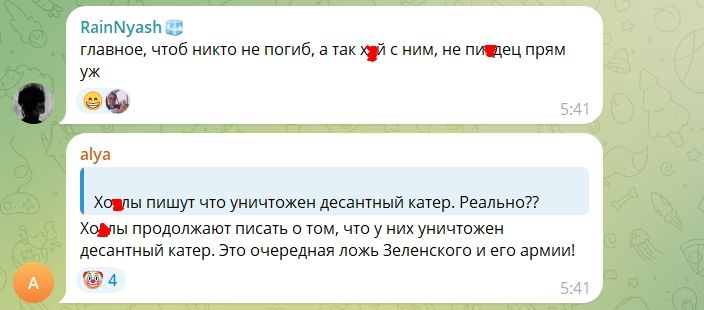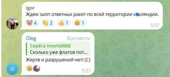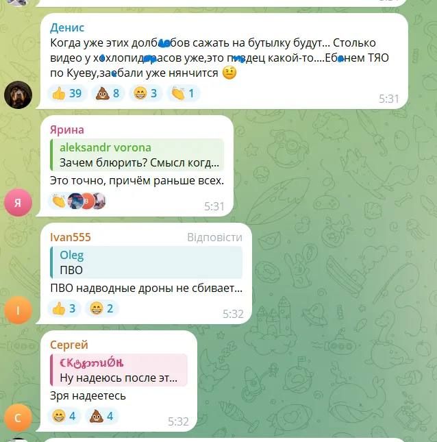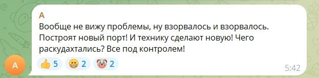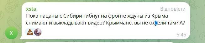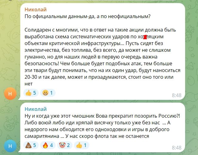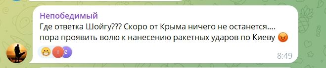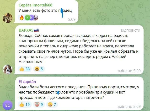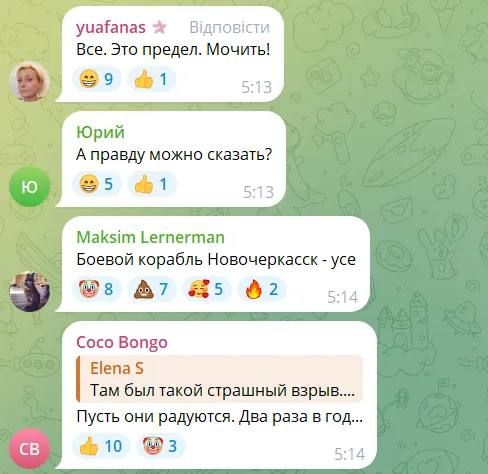 Чи не найбільша частина коментарів – це істерика росіян. Вони бідкаються на "пе-ве-о", яке не змогло захистити порт у Феодосії, звинувачують в усьому кримчан, які чекають на повернення України. Ба більше, росіяни виправдовують і ракетні удари по критичній інфраструктурі.