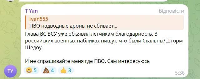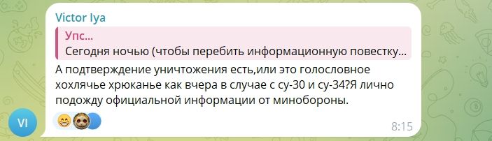 Російські загарбники заявили, що "Новочеркаськ" атакували "авіаційними керованими ракетами". Однак пропагандисти не могли просто визнати втрату. Вони також почали розповідати казки про "потужне російське пе-ве-о". Мовляв, в Криму не лише відбили атаку, але й буцімто "знищили" літаки, які атакували "Новочеркаськ".