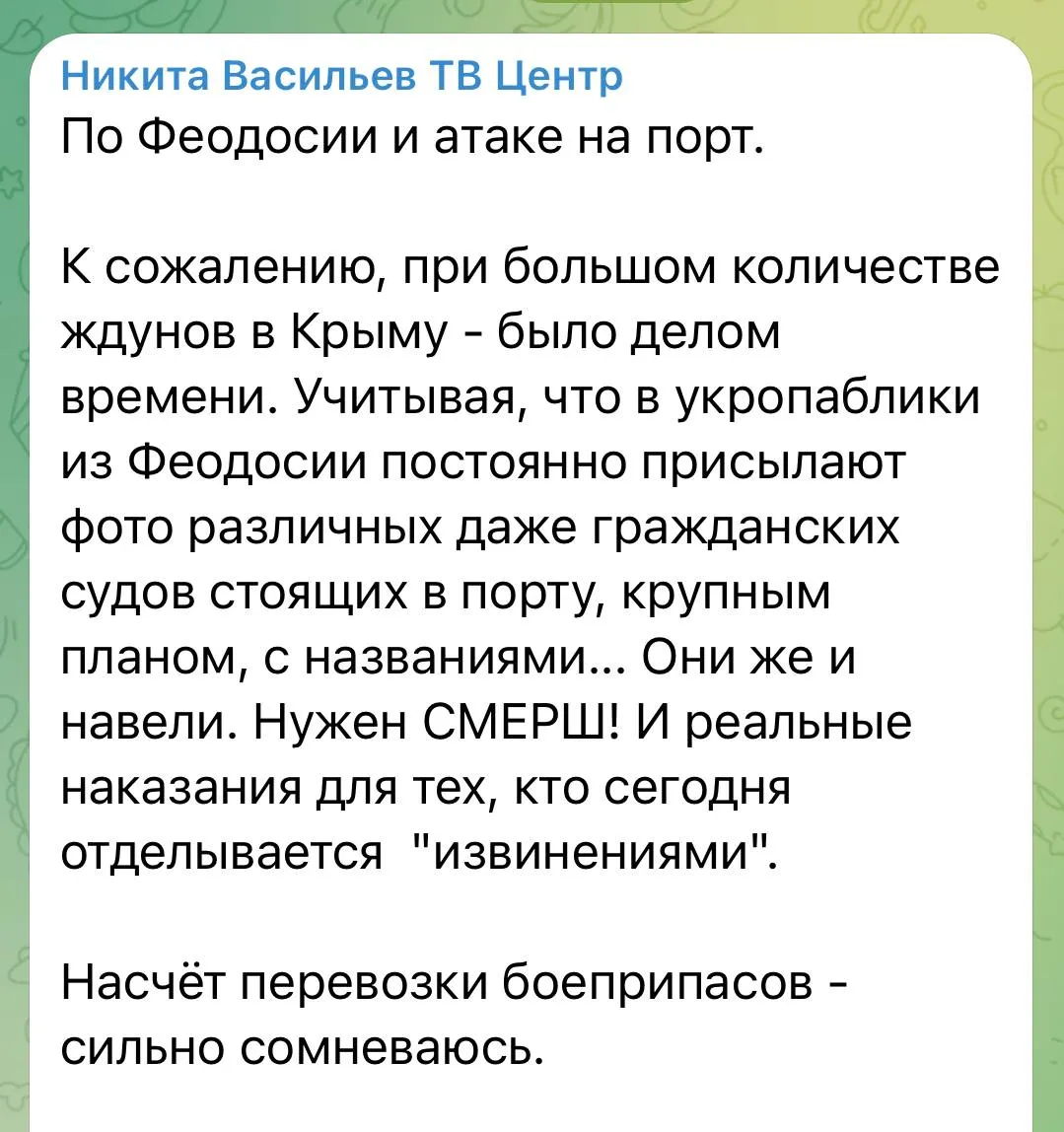 Бідкається на втрату ВДК "Новочеркаськ" і російський пропагандист, так званий "спецкор" Нікіта Васильєв. Він визнав, що судно опинилося під ударом, але водночас, як і більшість росіян, вимагає "покарання".