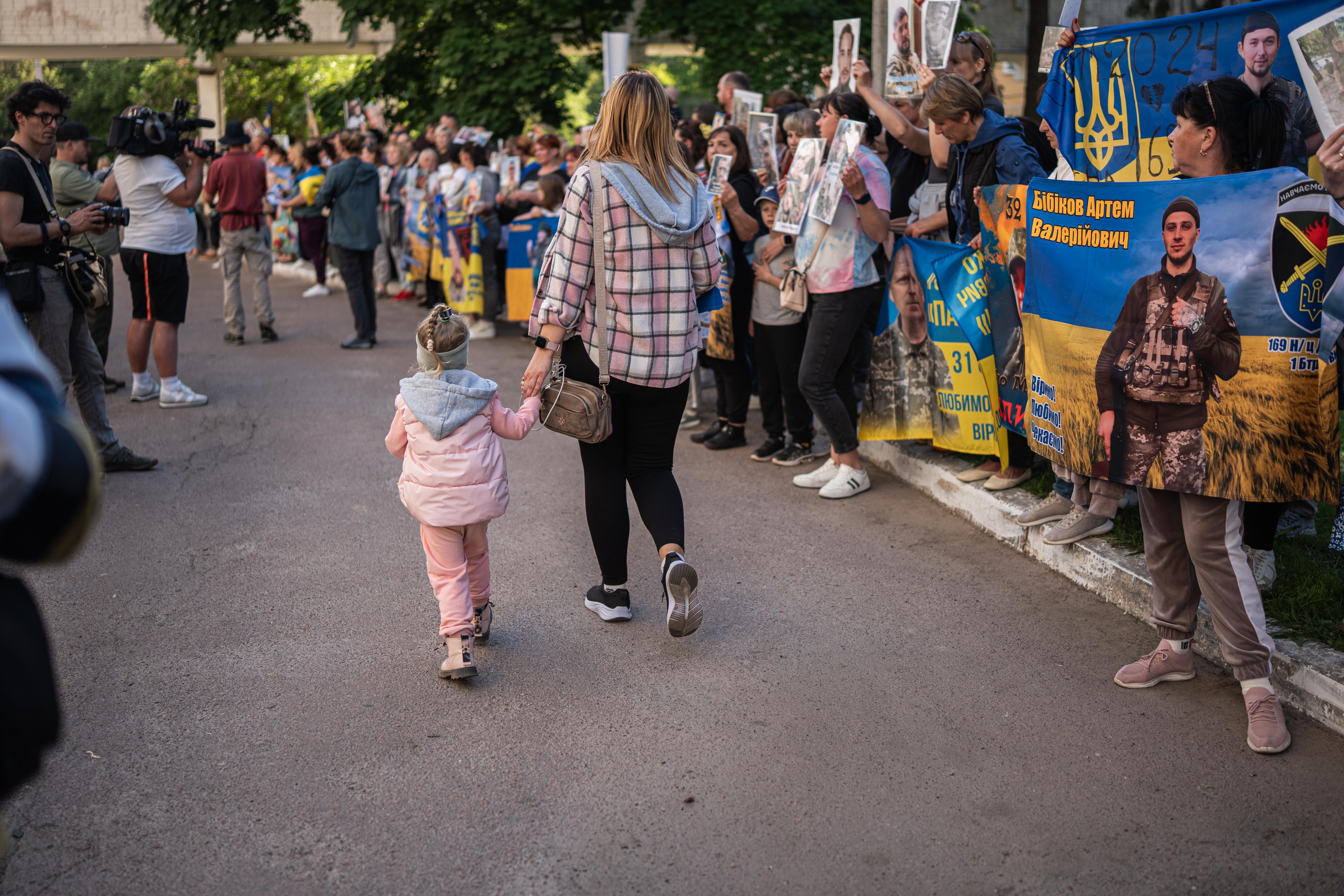 Серед тих, хто приїхав зустрічати звільнених з полону, – матір із донькою. Вони чекають на чоловіка та сина, який вже рік та 2 місяці вважається зниклим безвісти. Вони щоразу приїжджають на обміни у надії, якщо не зустріти його, то принаймні отримати від побратимів хоч якесь підтвердження про те, що він живий і у полоні.