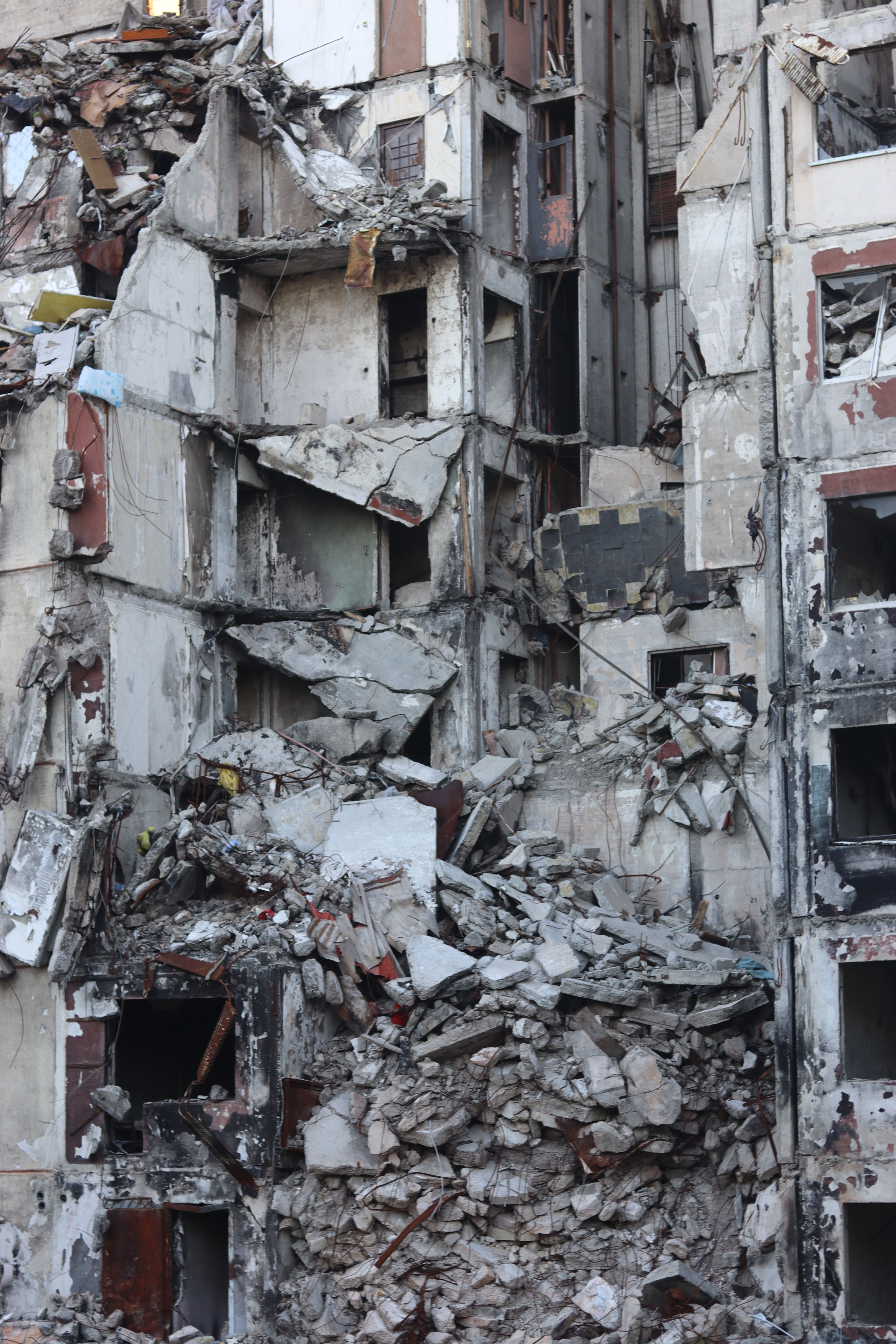 Від думки про те, що тепер у нас саме такі "визначні" місця, пересмикує. Війна внесла свої корективи у "туристичну" інфраструктуру міста. До цього будинку можна зайти. Він виконує певну роль музею, сховищем свідчень того, що російська армія намагалась зробити із цим містом. Повністю розбиті бетонні стіни стоять, як моторошне нагадування, що зовсім поряд живе ворог.