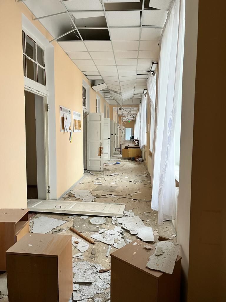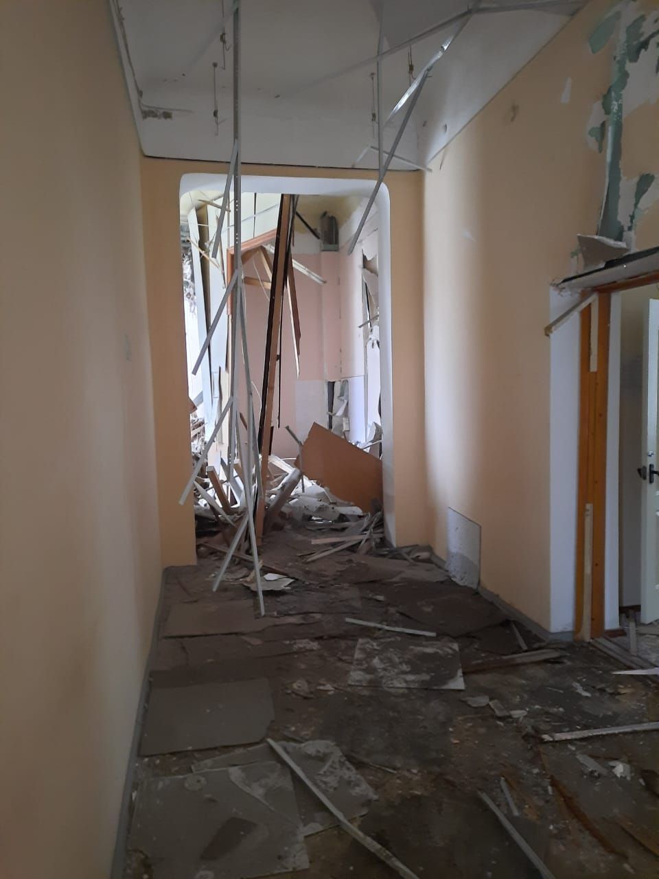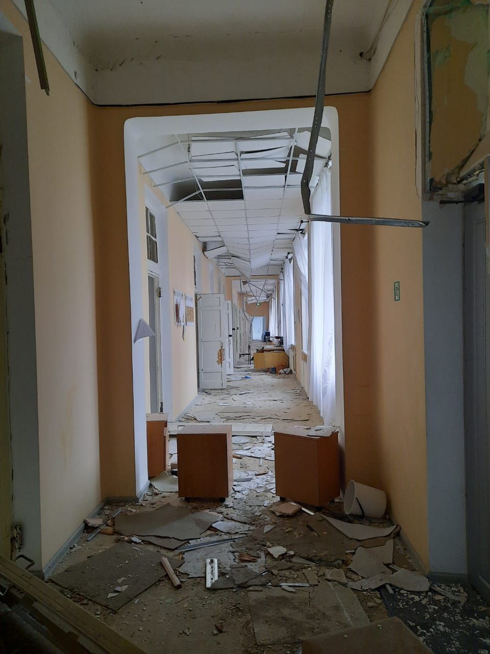 Соболевський опублікував наслідки обстрілів Херсона. З фото видно, що ударна хвиля розбила вікна лікарні, зруйнувала покриття та вибила двері у палатах.