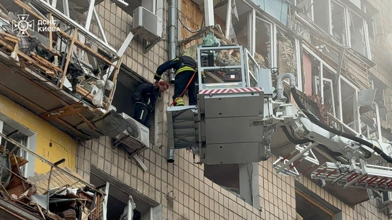 У Солом'янському районі столиці внаслідок влучання ракети у 9-поверхівку був повністю зруйнований один під'їзд, наразі існує загроза обвалу конструкцій. За даними ДСНС, постраждали 15 людей, також з-під завалів надзвичайники деблокували жінку.