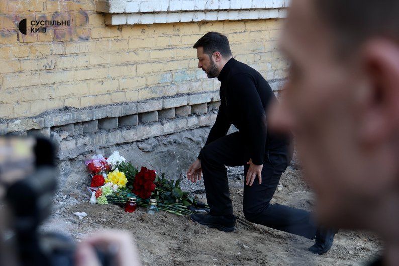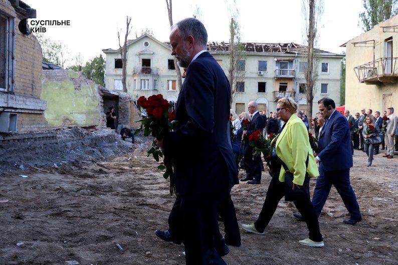 Президент Зеленський разом з представниками дипломатичних місій і міжнародних організацій та українськими посадовцями відвідали місце російської атаки у Святошинському районі.