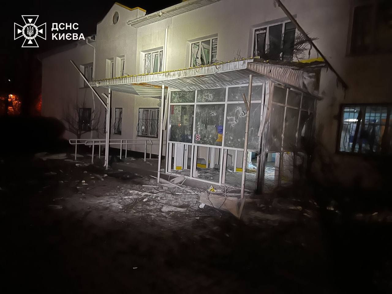 Унаслідок удару російських безпілотників по столиці в Дніпровському районі спалахнула пожежа в будівлі медичного закладу. Її вже вдалося загасити. Пошкоджені стіни будівлі, вибито вікна, а у дворі повалено дерева.