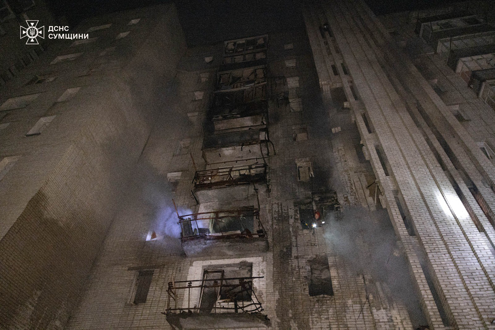 Внаслідок ударів росіян по 9-поверхівці у місті Охтирка на Сумщині виникла пожежа з 2 по 5 поверхи.