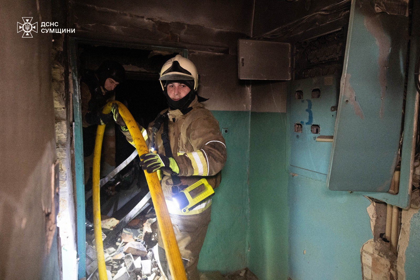 В Охтирці росіяни влучили у багатоповерхівку трьома ударними БпЛА. Будинок зазнав масштабних пошкоджень.