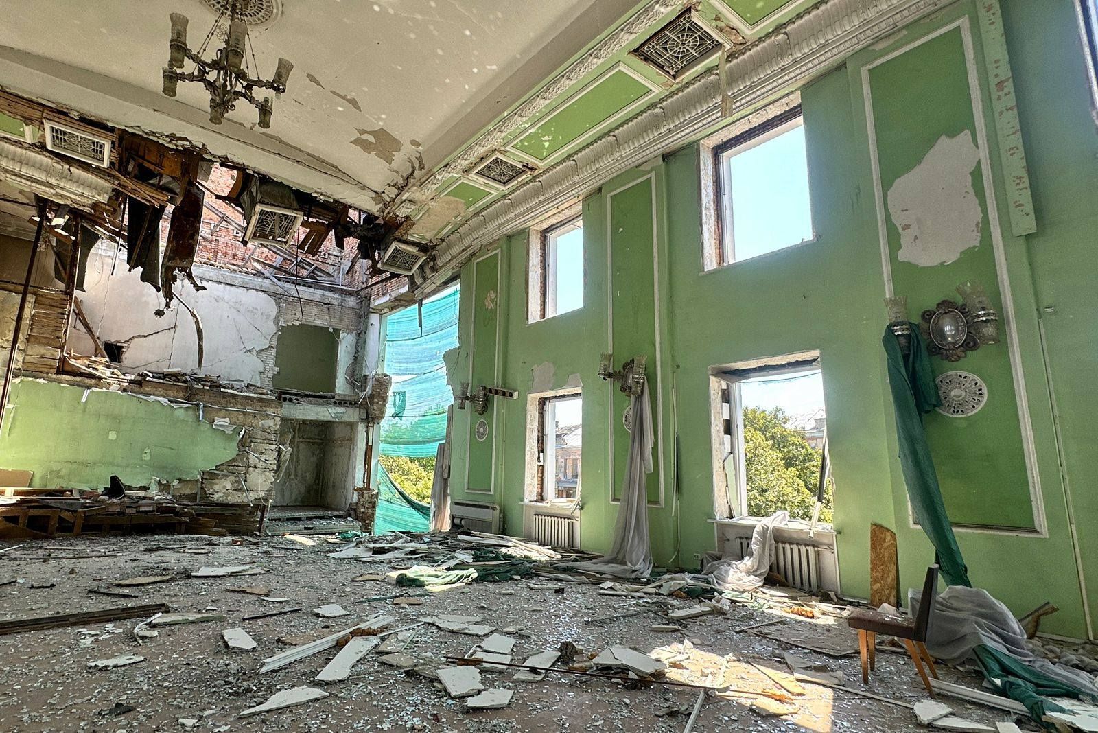 Юрій Соболевський показав, що зараз із середини виглядає будівля Херсонської облради та ОВА після кількох ракетних ударів і нещодавніх авіаударів керованими авіабомбами (КАБами).