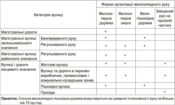 В зависимости от категорий улиц и дорог определяются соответствующие формы организации велосипедного движения в населенных пунктах: