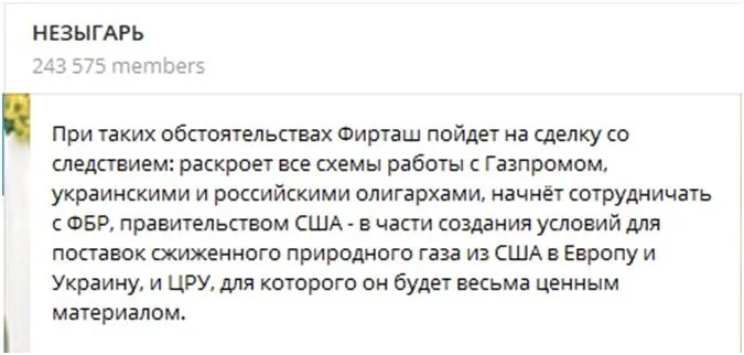 За інформацією Telegram-каналу "НЕЗЫГАРЬ", – Фірташ піде на угоду зі слідством. Тим самим, розкриє всі схеми роботи з "Газпромом", українськими та російськими олігархами, почне співпрацювати з ФБР, урядом США – в частині створення умов для поставок скрапленого природного газу з США в Європу і Україну.