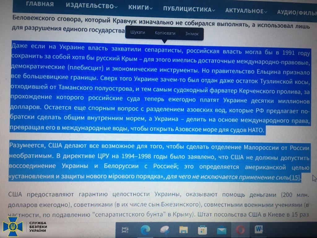 СБУ виявила літературу, в якій заперечується існування українського народу, його мови, а також саме право України на державність, і, навпаки, наголошується, що це нібито штучно створена держава,
