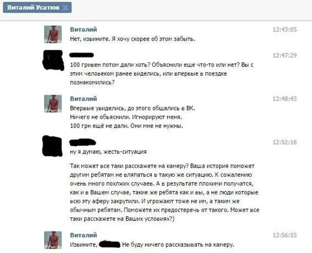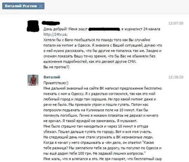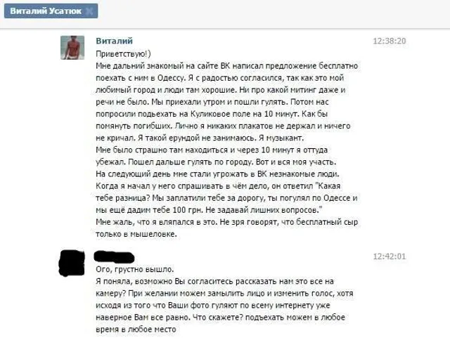 "Наступного дня мені стали погрожувати в ВК незнайомі люди. Коли я почав у нього питати в чому справа, він відповів "Яка тобі різниця, ми заплатили тобі за дорогу, ти погуляв по Одесі і ми ще дамо тобі 100 гривень. Не задавай зайвих питань", — додав Усатюк.