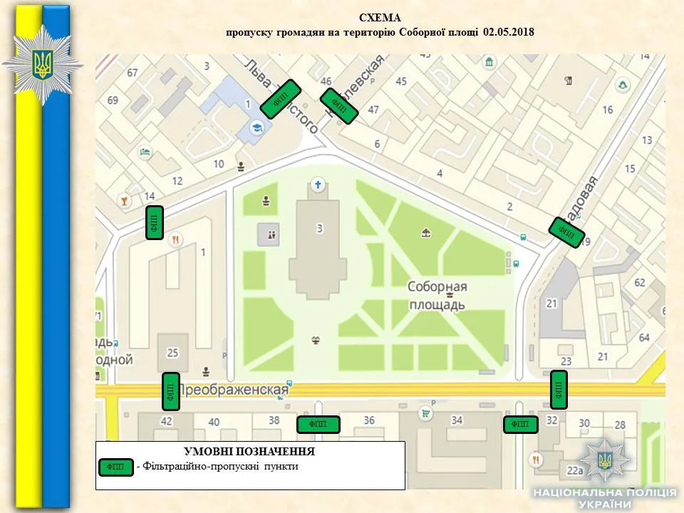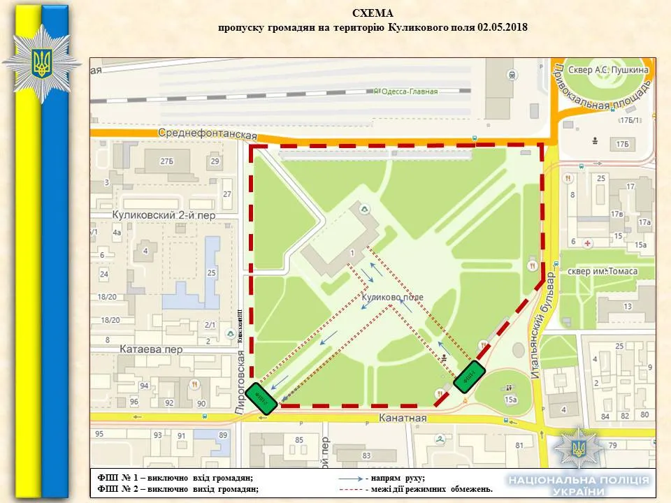 "З метою недопущення масових заворушень, запобігання загрозам публічній безпеці і порядку, а також охорони життя і здоров’я людей, на Куликовому полі та Соборній площі, а також на прилеглих до них територіях будуть введенні тимчасові обмеження доступу громадян. По периметру вказаних місць будуть виставлені працівники поліції. Вхід на їх території буде здійснюватися тільки через встановлені там фільтраційні пункти", – попередили у поліції Одеської області.