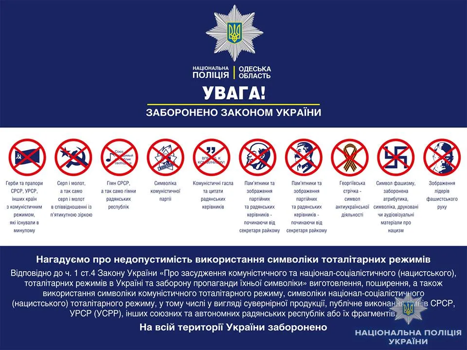 Окрім того, в поліції нагадали, що відповідно до статті 436-1 Закону України "Про засудження комуністичного та націонал-соціалістичного (нацистського) тоталітарних режимів в Україні та заборону пропаганди їхньої символіки", заборонено виготовлення, поширення, а також публічне використання символіки комуністичного, націонал-соціалістичного тоталітарних режимів, у тому числі у вигляді сувенірної продукції, публічне виконання гімнів союзних та автономних радянських республік або їх фрагментів на всій території України, крім випадків, передбачених законом. За вказані дії передбачено обмеження волі на строк до п'яти років або позбавлення волі на той самий строк, з конфіскацією майна.