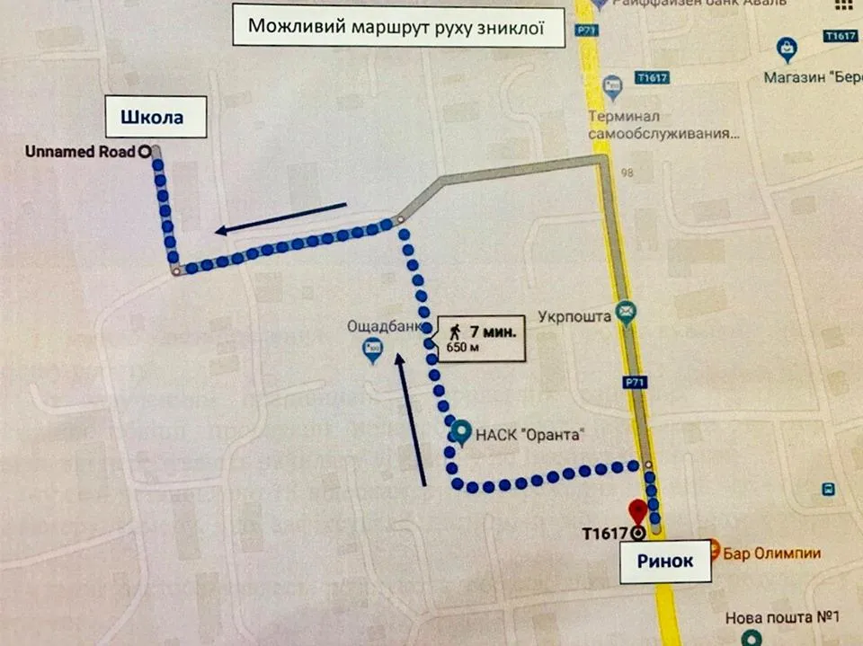 Крім того, у мережі з’явилися схеми руху дівчинки у день зникнення та імовірного району інциденту. За словами заступника голови Нацполіції В’ячеслава Аброськіна, Дарія Лук’яненко зникла 13 червня у проміжку з 13:41 до 14:24. Місцеві ЗМІ пишуть, що востаннє її бачили недалеко від ринку. Поліція підозрює, що дитина стала об'єктом злочину.