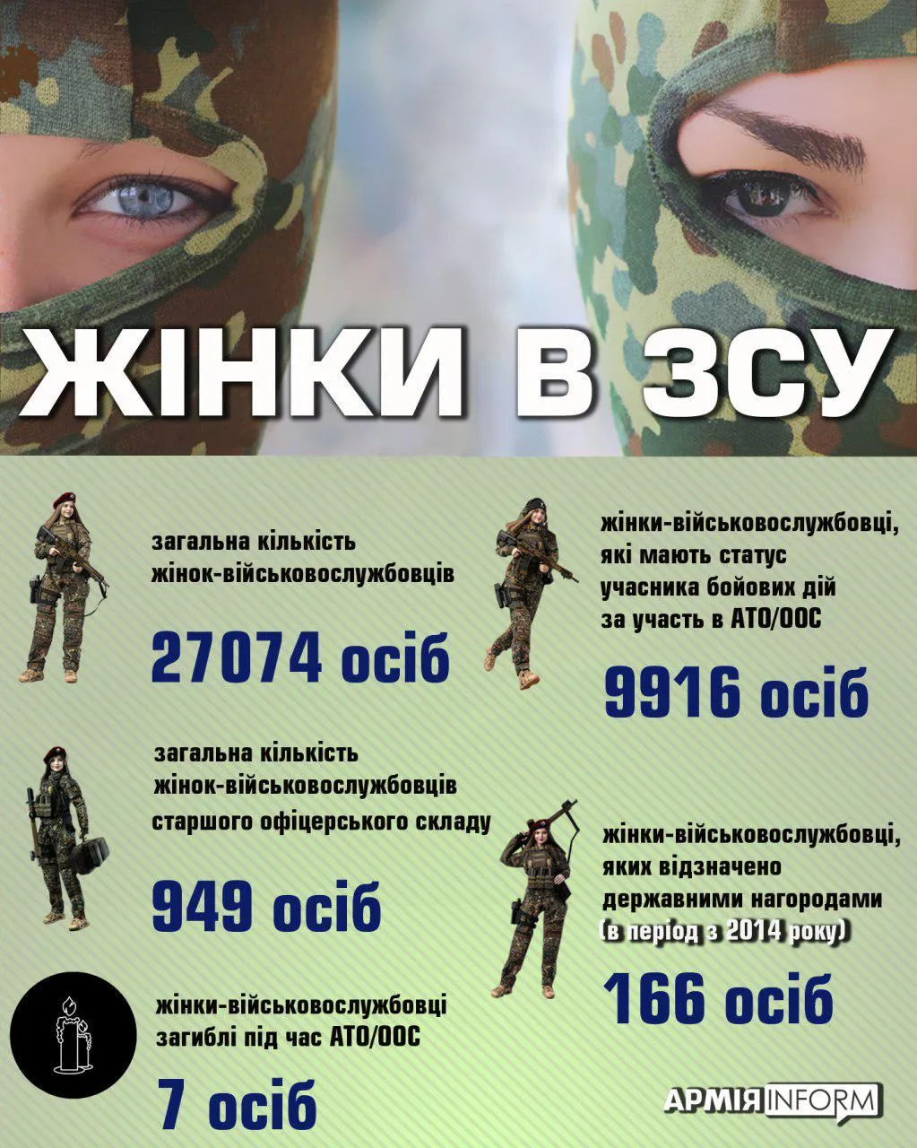 Відзначимо, що у Збройних силах України на військовій службі перебувають понад 27 тисяч жінок. Під час проведення військових дій на Донбасі загинули 7 жінок-військовослужбовців.