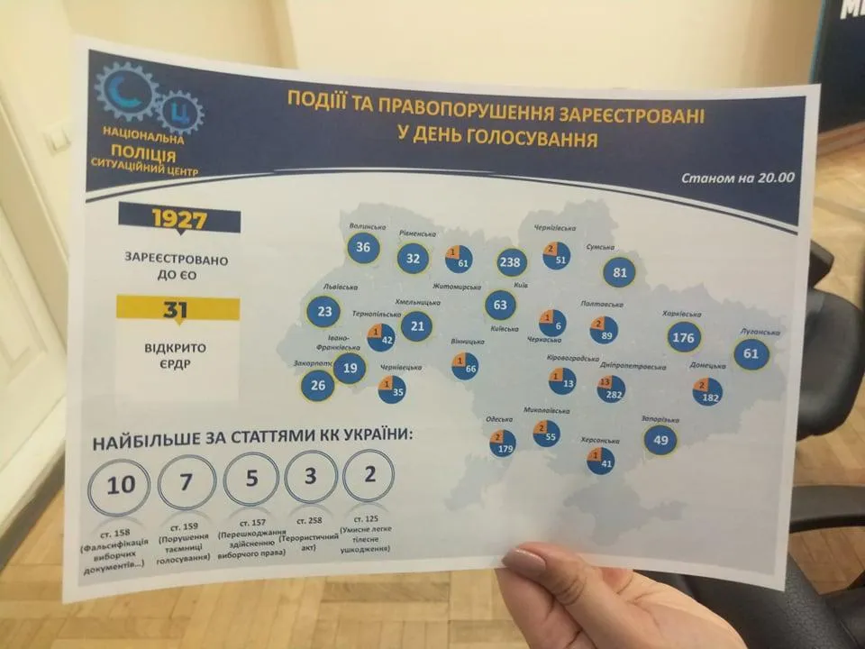Вибори в Україні пройшли загалом спокійно, проте у деяких регіонах все ж зафіксували низку порушень. Поліція зареєструвала 1927 заяв про порушення. Найбільше порушень зафіксували у Дніпропетровській області – 282 та Київській – 238.