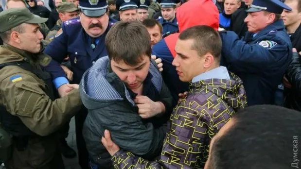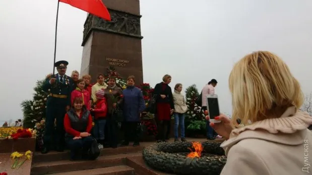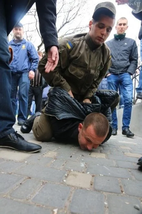 Як пише видання Думская, до пам’ятника підійшли і євромайданівці. Один з них зірвав георгіївську стрічку, після чого між чоловіками виникла бійка.