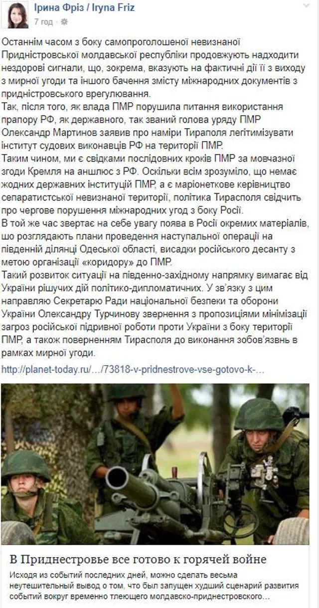 У зв'язку з цим депутат звернулась до секретаря РНБО Олександра Турчинова з пропозицією мінімізувати загрозу з боку РФ, яка може використати території "Придністров'я" для наступу на Одещину.