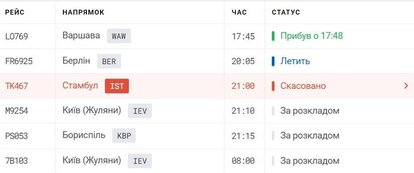 На табло вказано, що сьогодні не буде сполучення між Одесою та Стамбулом. Літак з Туреччини мав прилетіти о 21 годині, а відбути у зворотному напрямі вже через 50 хвилин.