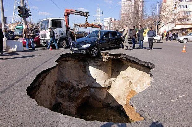 На розі Люстдорфської дороги та вулиці Левітана з’явилася величезна яма. У цей провал ледь не впала автівка. На щастя, ніхто не постраждав.