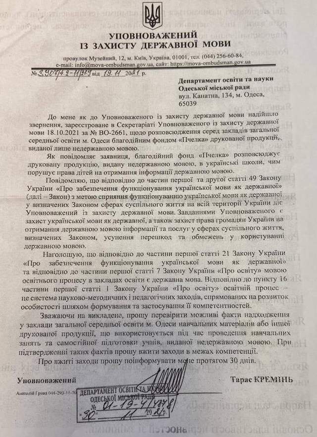 Звернення до омбудсмена надійшло 7 жовтня, а вже за кілька місяців він надіслав відповідь до міськради Одеси. Кремінь зазначив, що в листі до нього вказали на можливе порушення закону. Мовляв, це може порушувати права дітей на отримання освіти державною мовою.