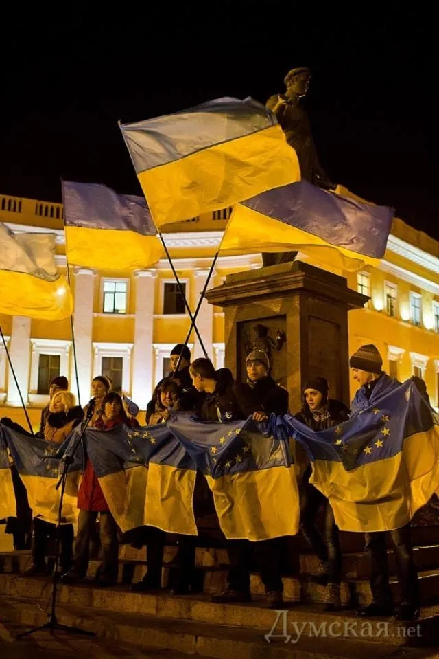 Сьогодні на одеському Євромайдані присутнім роздавали українські прапори з європейськими зірками на блакитній частині стягу.