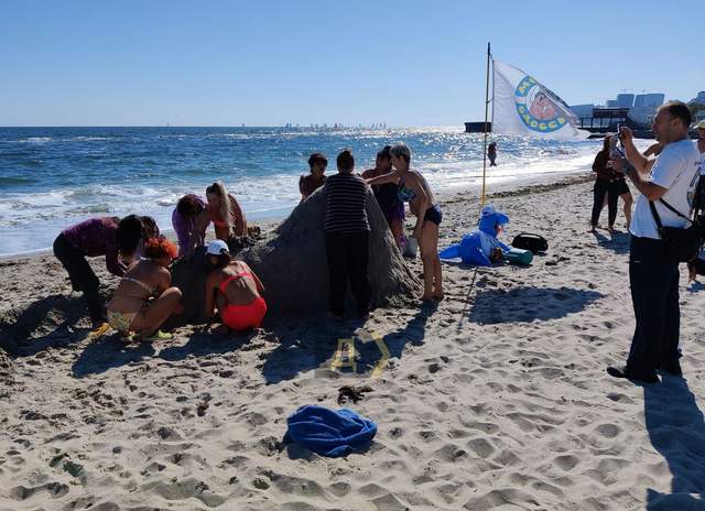 Також вона додала, що зробити таку велику скульптурку вдалося лише завдяки тому, що до цього залучили багато людей. На фото помітно, що частина з учасників дійства були в купальниках і плавках.