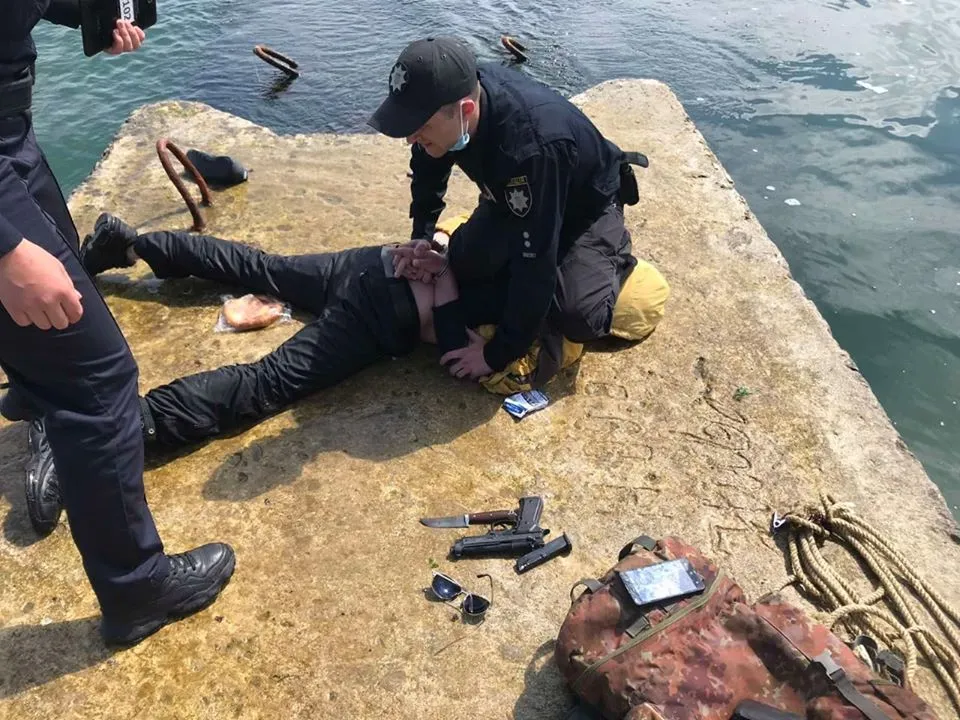 Чоловік намагався пробратися на затонулий танкер, в нього виявили травматичний пістолет та ніж (фото: Микола Покровський)