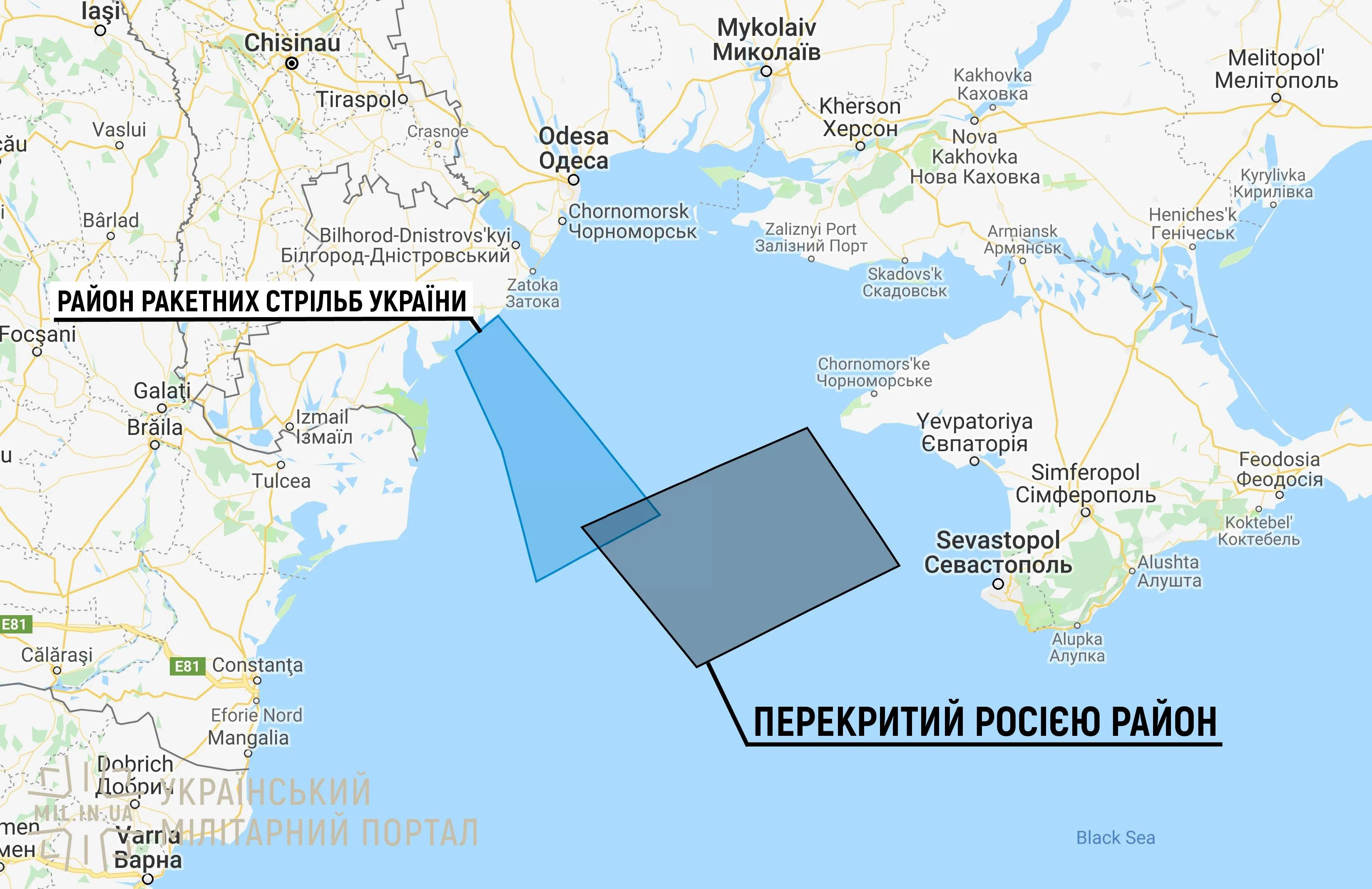 Район ракетних стрільб України та перекритий Росією район у Чорному морі