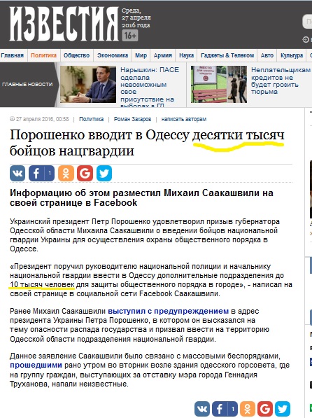 А через годину видання "Известия" змінило цю цифру, випустивши новину під заголовком: "Порошенко вводить в Одесу десятки тисяч бійців Нацгвардії". А в тексті замість тисячі військовослужбовців, журналісти видання написали про 10 тисяч Нацгвардійців.