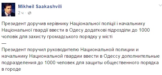 Губернатор Одеської області Михайло Саакашвілі повідомив, що у відповідь на його звернення Порошенко доручив Нацгвардії і Нацполиции направити в Одесу до тисячі своїх представників.