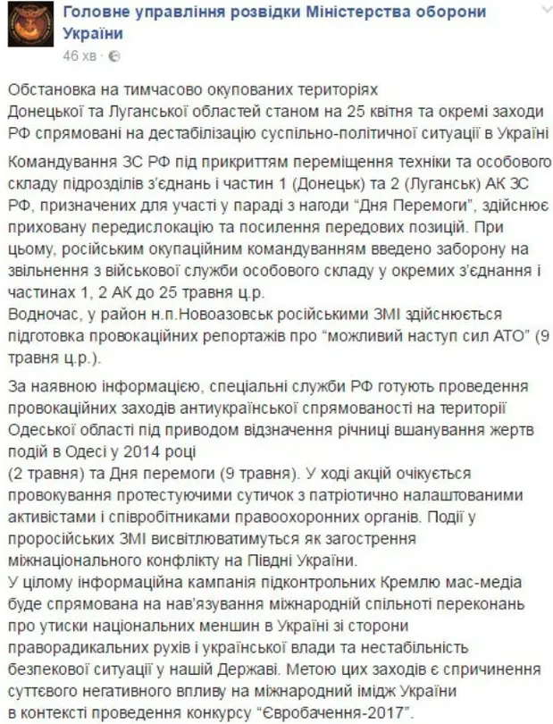 Крім того, у розвідці дізналися, що російські пропагандистські медіа будуть працювати на те, щоб нав’язати міжнародній спільноті ідеї про утиски національних меншин в Україні праворадикалами. Зокрема, під час проведення Євробачення-2017.