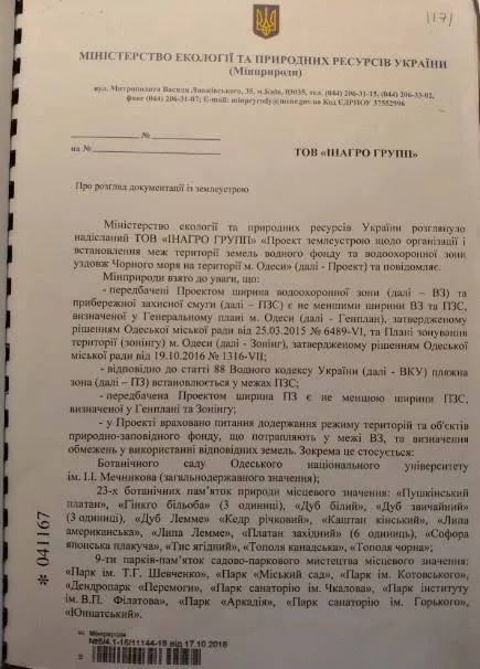 Лист-відповідь від Мініекології і природних ресурсів щодо скандального проекту Одеської міськради