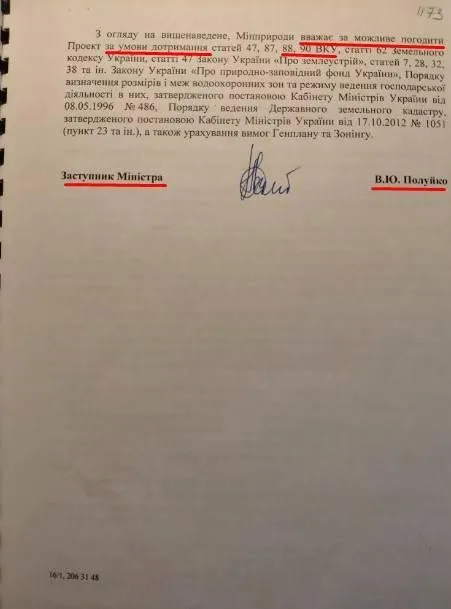 У відповіді Міністерства екології за підписом заступника міністра Василя Полуйка йдеться про те, що "за умови дотримання" кількох статей Земельного та Водного кодексів України, в тому числі 88 і 90 статей, проект можливо погодити.