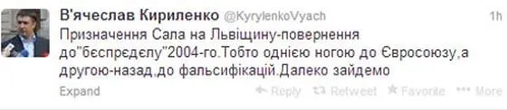 "Назначение Сала на Львовщине - возвращение к "беспределу" 2004 го. То есть, одной ногой в Евросоюз, а второй-назад, к фальсификациям. Далеко зайдем", - написал политик.