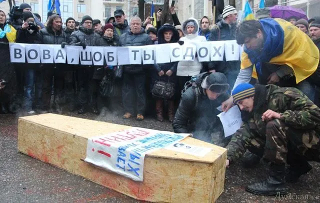 Люди кричали "позор", а затем под возгласы "Путин, вон из Украины" подожгли гроб. Когда от него остался лишь пепел, объявили минуту молчания, которую назвали минутой радости, потому что "умер Путин". Кроме этого, активисты выдвинули множество требований: называть войну войной, перевести экономику страны на военные рельсы, а также призвать российские войска покинуть территорию Украины,