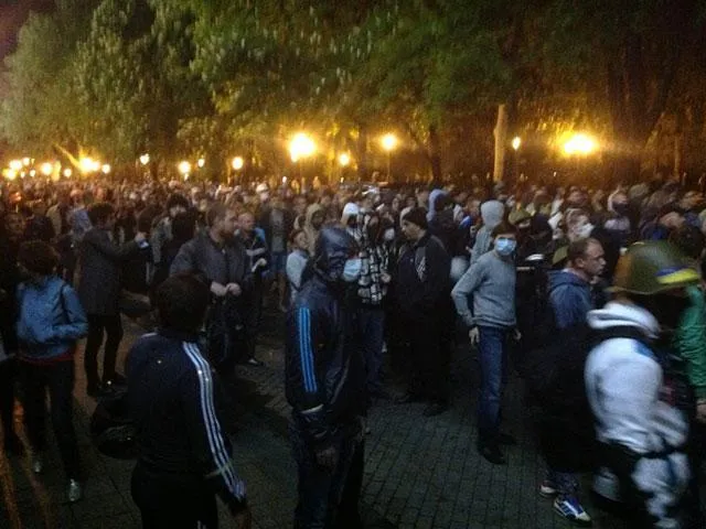Как известно, несколько сотен людей раньше перекрыли улицу Преображенскую на участке от Бунина к Жуковскому, чтобы помешать правоохранителям вывезти из здания горуправления милиции активистов Куликова поля, задержанных после событий 2 мая. Сепаратистам удалось проникнуть во внутренний двор милиции, они выбили в здании окна.