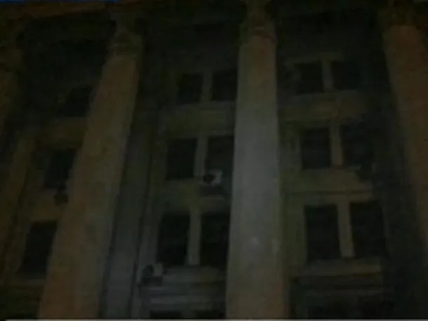 Российского флага на флагштоке не увидели, однако, когда он был снят - не известно. Теперь перед Домом профсоюзов развевается приспущенный украинский флаг, символизирующий траур по погибшим. После установления государственного флага активисты почтили память жертв 2 мая минутой молчания, а затем спели гимн.