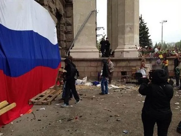 Установление российского флага на Доме профсоюзов днем 4 мая