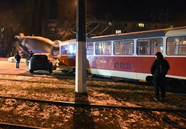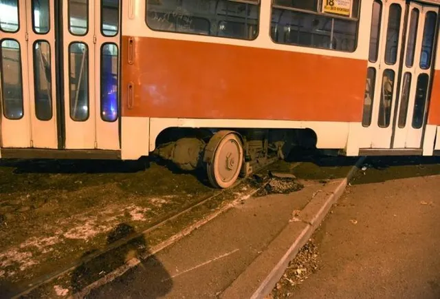 Трамвай наехал на этот предмет, и вагон сошел с рельсов, столкнувшись с припаркованным автомобилем.