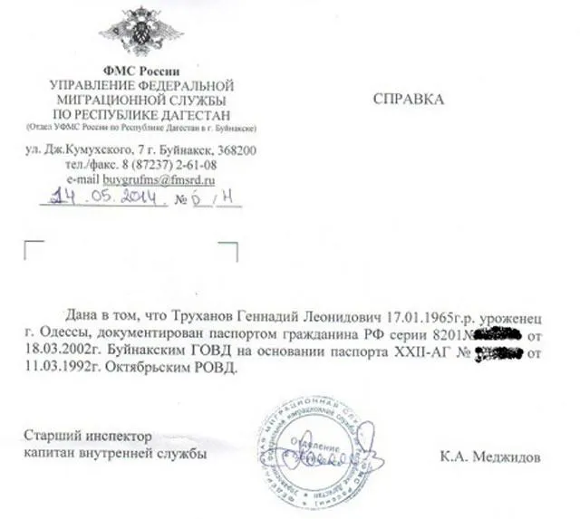 "Так, по данным Федеральной миграционной службы РФ, уроженец города Одессы, Труханов Геннадий Леонидович, 1965 г. рождения является владельцем паспорта гражданина РФ с пропиской в г. Буйнакск (Республика Дагестан). Паспорт выдан Буйнакским городским отделом внутренних дел на основе паспорта, который был ранее получен в связи с увольнением в запас из рядов Вооруженных сил РФ", - пишет издание.