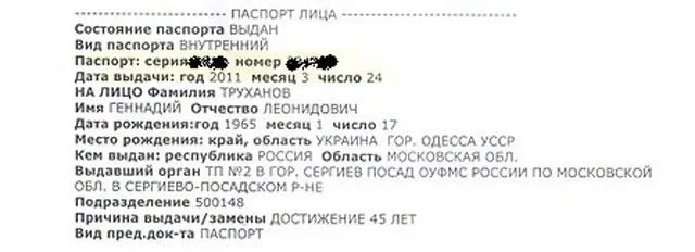 Кроме того, по официальным данным, Труханов имеет и второй действительный паспорт гражданина РФ с пропиской в г. Сергиев-Посад (Московская область), выданный в связи с достижением 45 лет 24 марта 2011 года. Данный паспорт был получен в г.Сергиев-Посад 15 апреля 2003 года в связи с получением гражданства РФ.