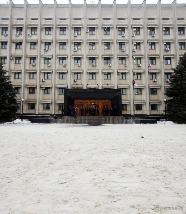 Внутри ОГА группируются милиционеры, бойцы спецподразделения службы охраны "Титан" и неизвестные граждане в полувоенной форме.