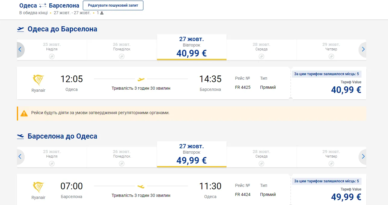 На офіційному сайті лоукостера вже з'явилися квитки на рейси "Одеса – Барселона". Щоправда, авіакомпанія поставила примітку: рейси юудуть виконувати тільки після затвердження регуляторними органами.