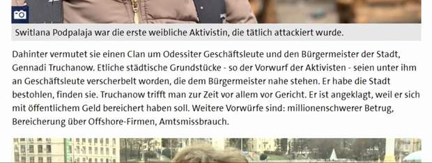 "...Клан одеських бізнесменів і мера Труханова. Декілька міських ділянок, які виявили активісти, були продані підприємцям, близьким до мера. Вони разом обкрадають місто, вважають активісти. На даний час справи Труханова в суді. Його звинувачують у розкраданні державних коштів", – написало видання Tagesschau.