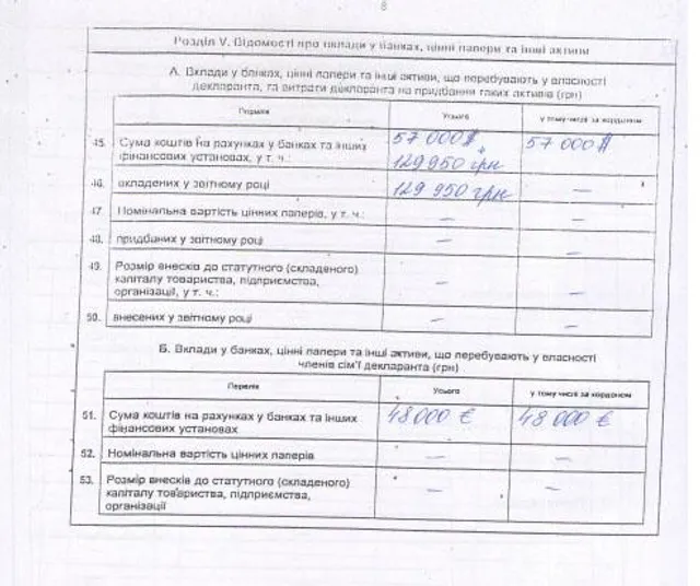 Також у власності його родини є квартира площею 754 квадратних метри. На рахунках глави Одещини — 129 950 гривень та 57 тисяч доларів. На банківському рахунку у сім'ї — 48 тисяч євро.