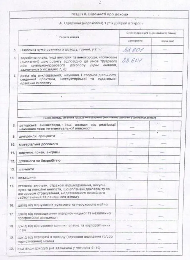 У документі нема жодного авто, а весь його дохід — це лише зарплата: 38 601 гривень.