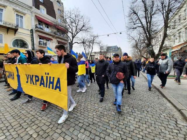 На Марш єднання вийшли кілька тисяч одеситів. Усі вони пройшли містом під синьо-жовтими прапорами, вигукуючи патріотичні гасла.