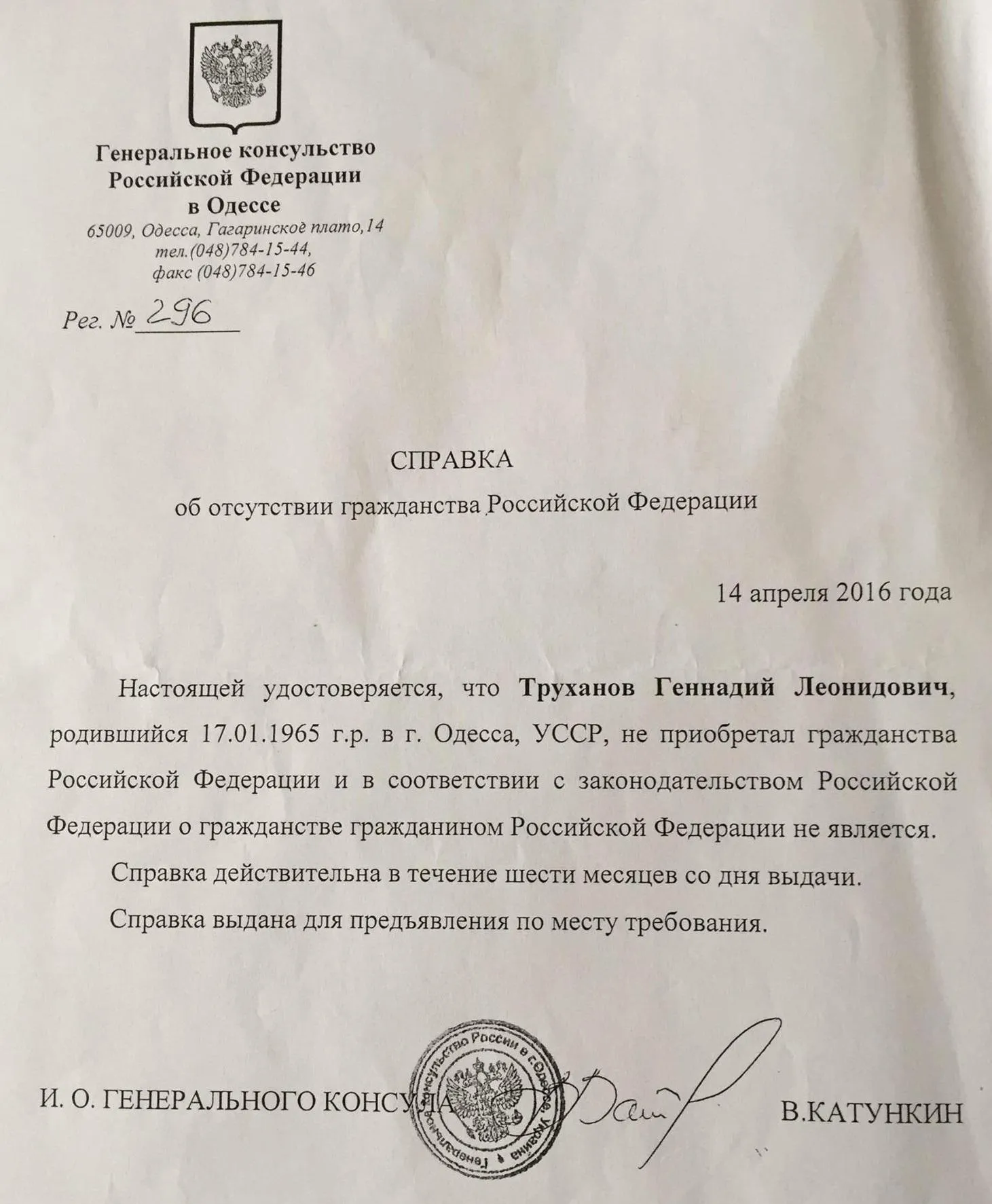 Довідка Генконсульства РФ в Одесі щодо російського громадянства Труханова
